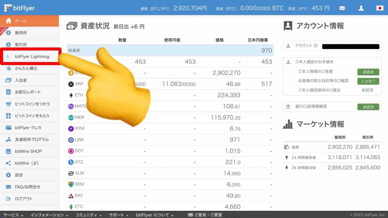 ビットフライヤーにログインし【bitFlyer Lightning】をクリックします。