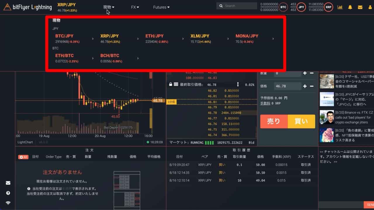 ビットフライヤーの取引所で売買できる銘柄