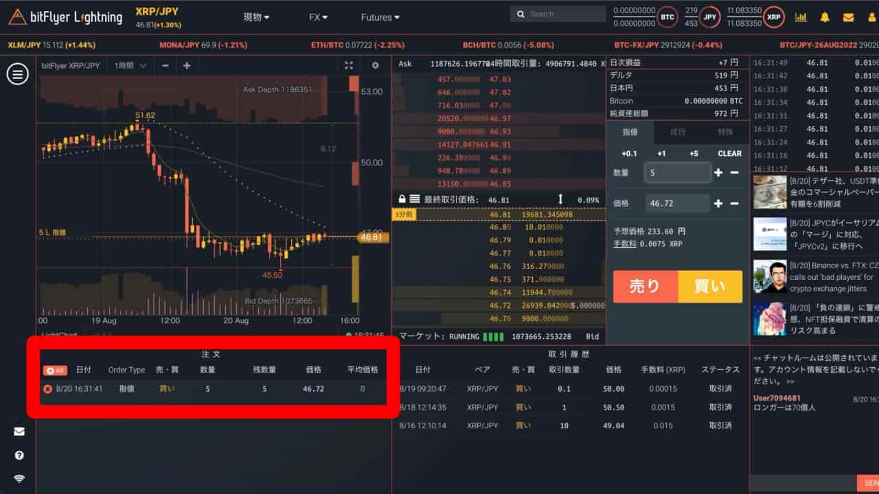 ❸『成行』のため、即約定され『取引履歴』に表示されます。