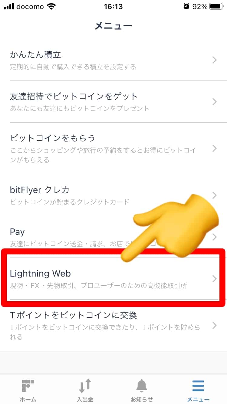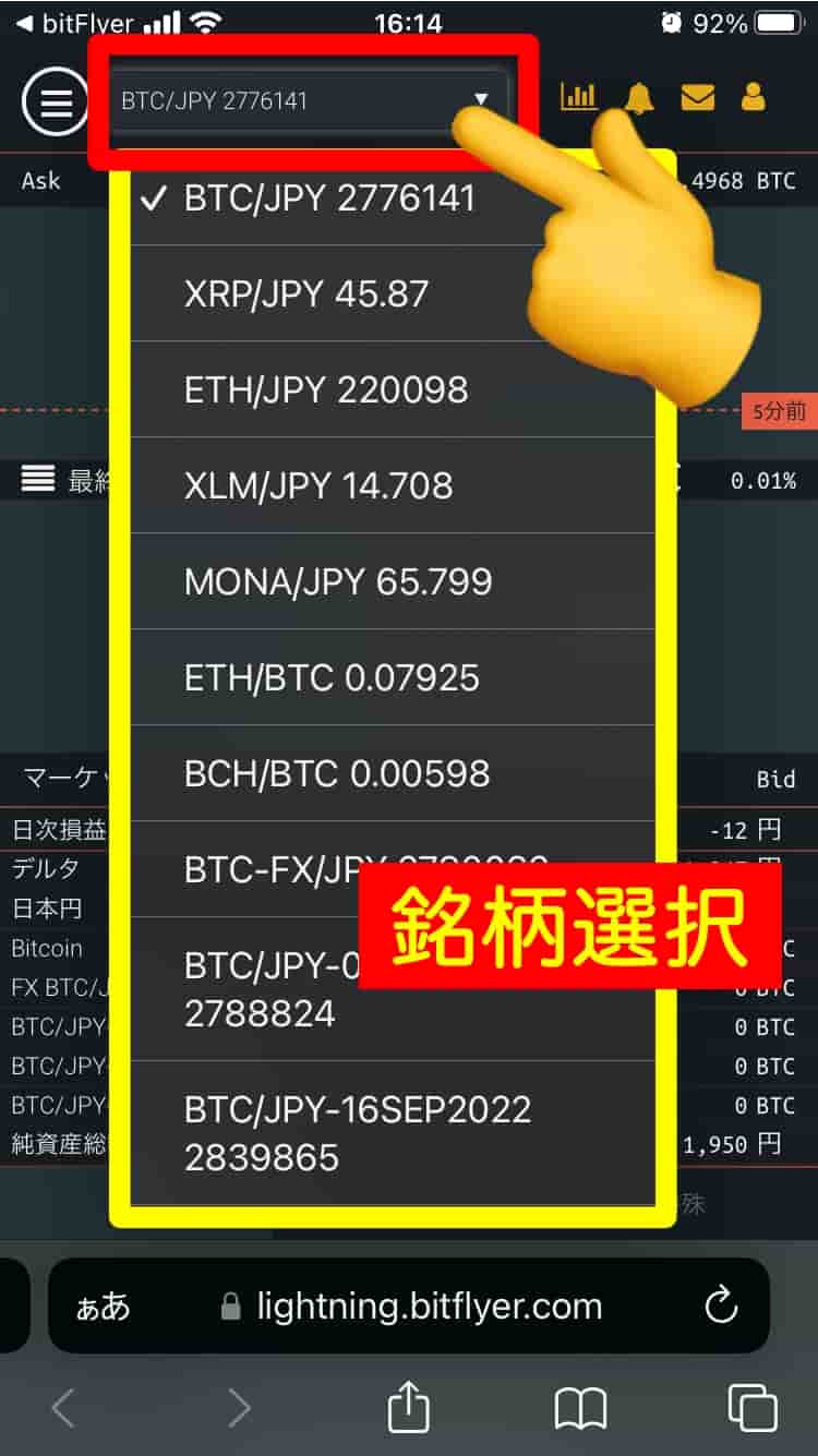 ❷スマホのブラウザで『Lightning』が表示されます。赤枠部分をタップして、取引銘柄を選択します。
