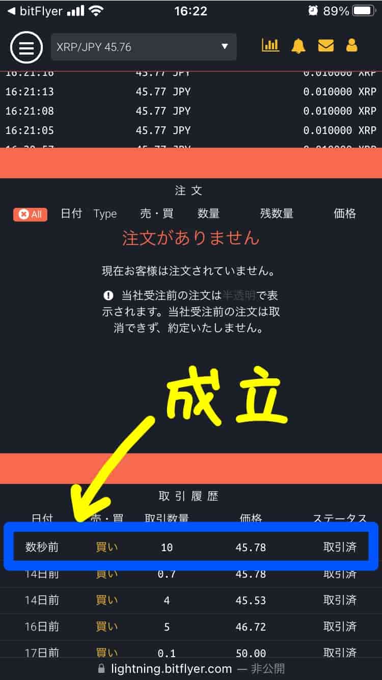 約定されたら注文一覧から消え、約定履歴に表示されます。