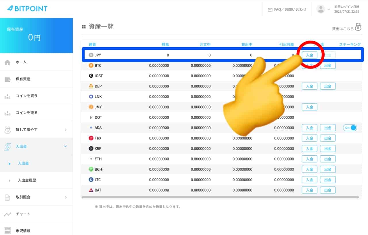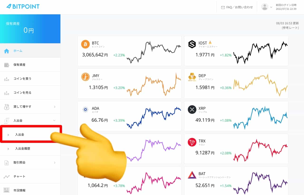 ❶『BITPOINT』サイトへログインし【入出金】をクリックします。