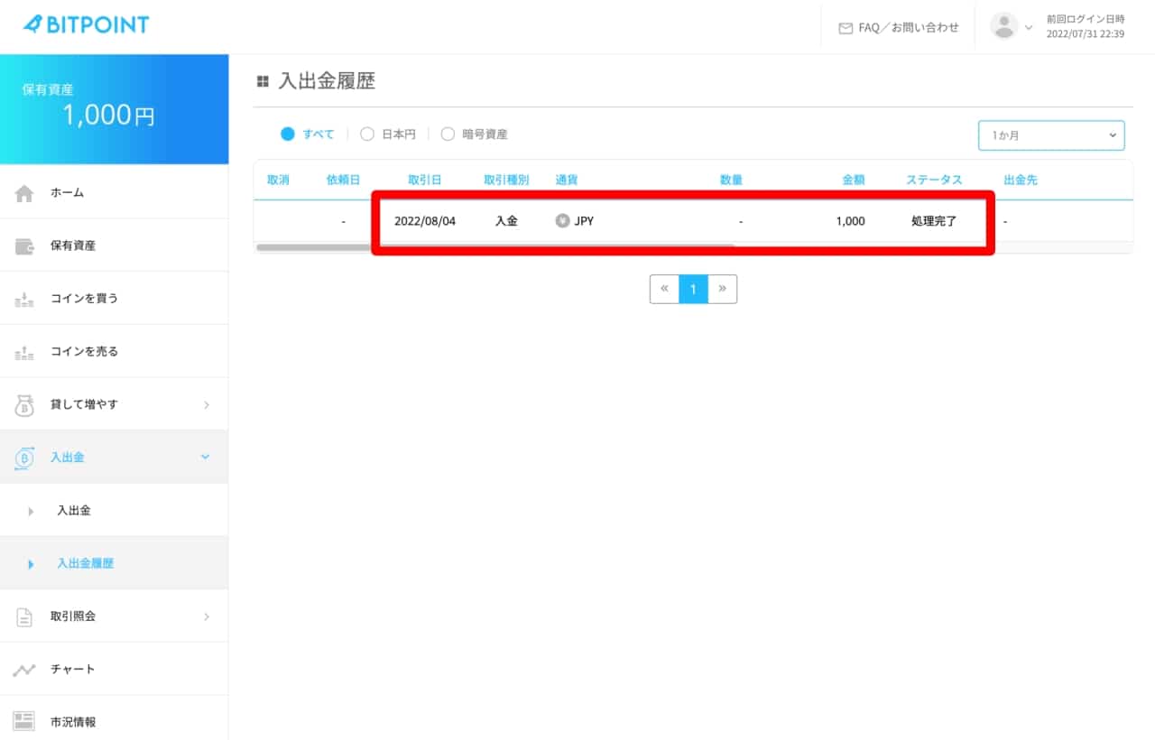 ❸左メニューの【入出金履歴】をクリックして、入金されている事を確認します。