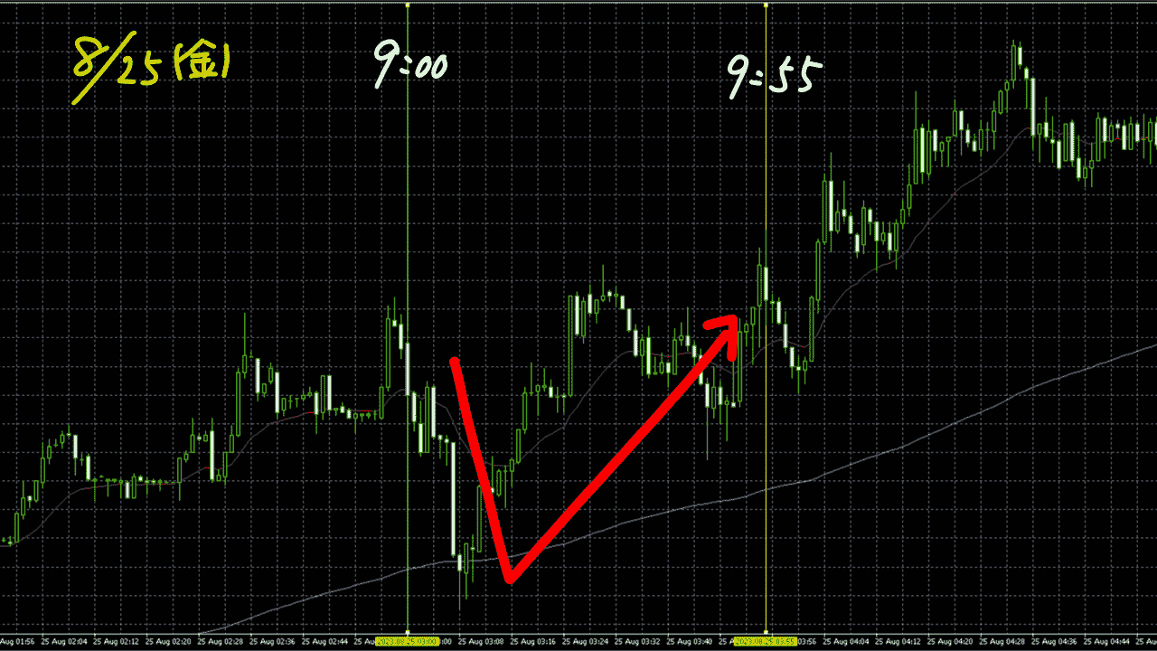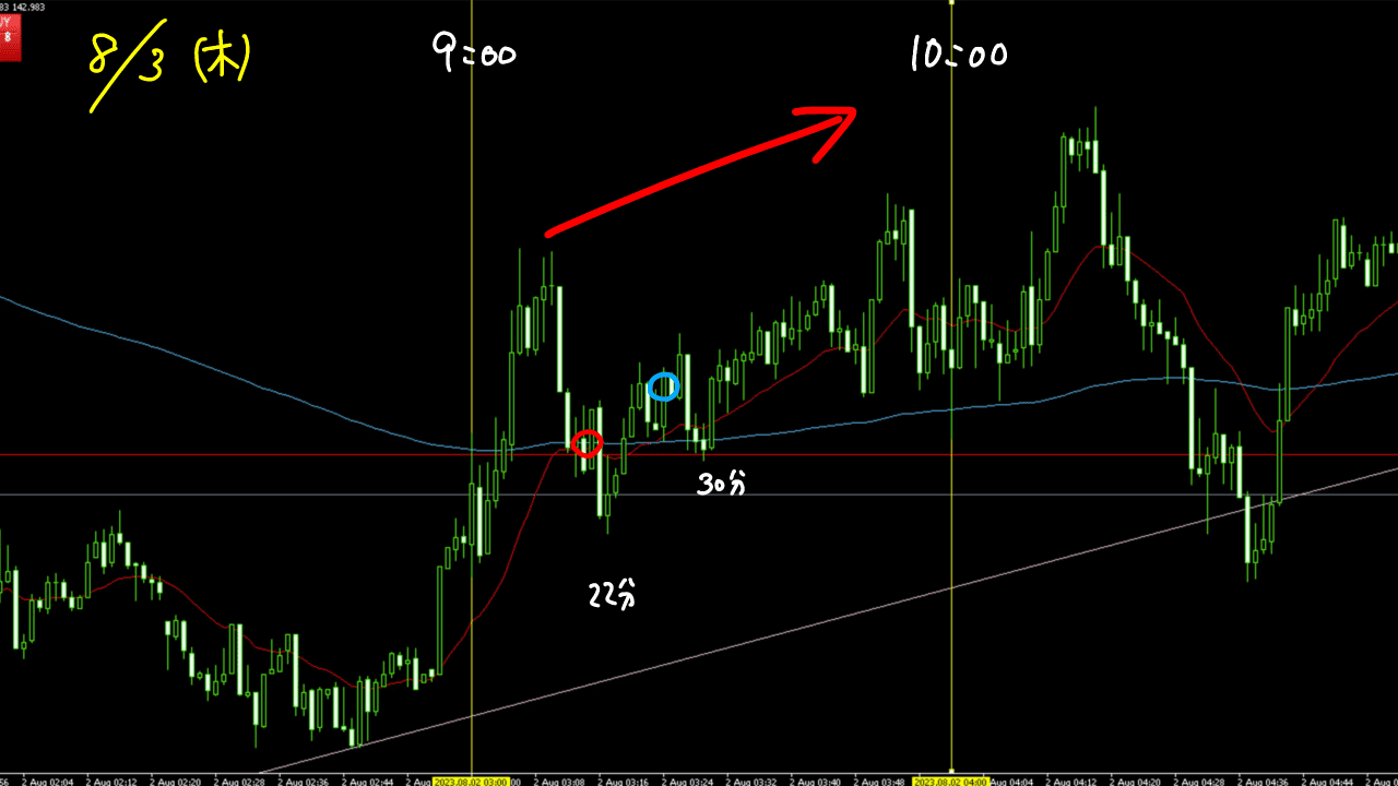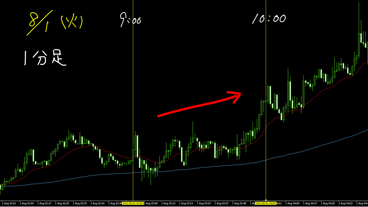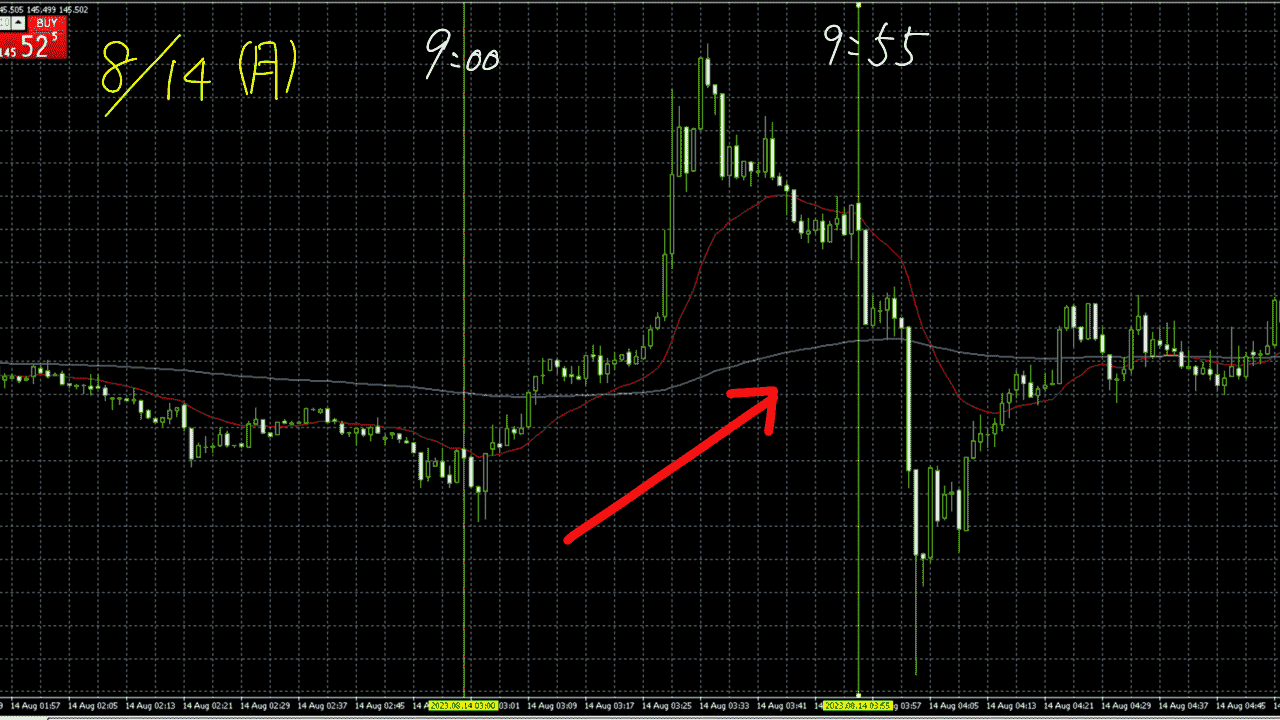 9時前に下落。9時突入で上昇。ここまでは前日と同じ動き。
